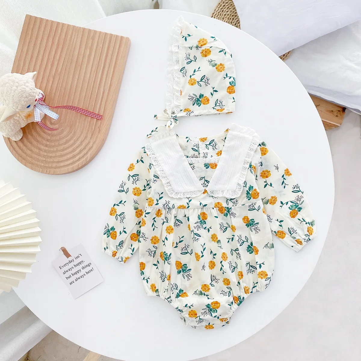 Autumn Long Sleeve Princess Floral Baby Girls Bodysuits Clothing with Hat