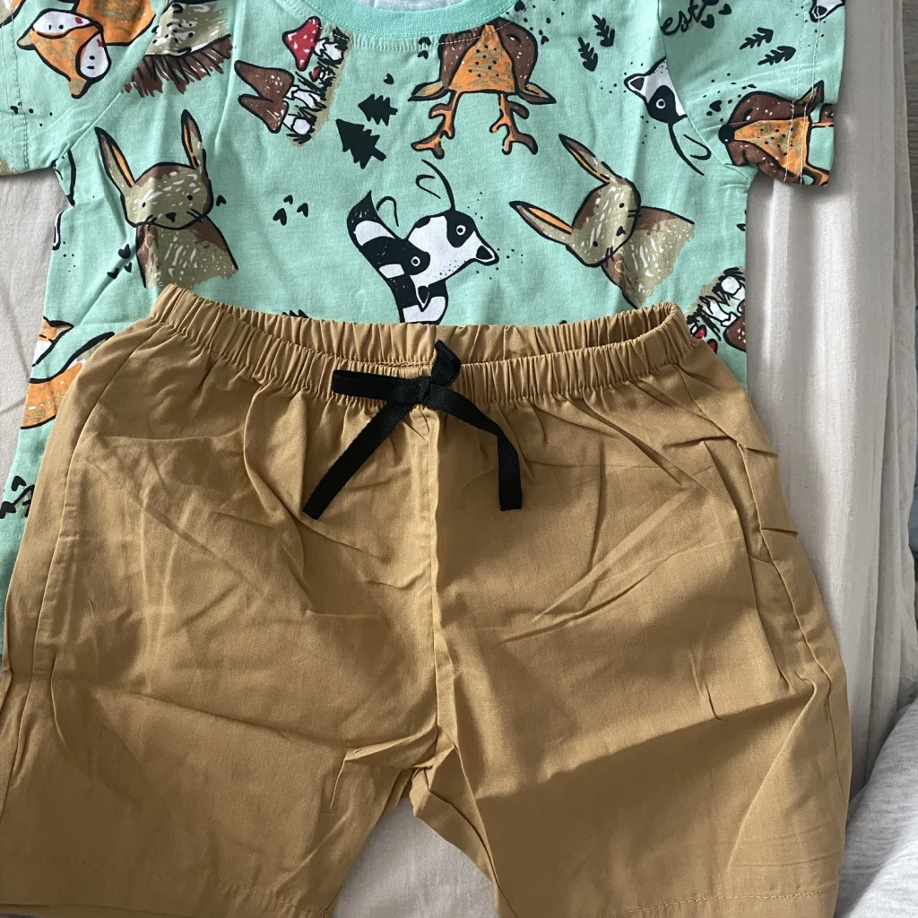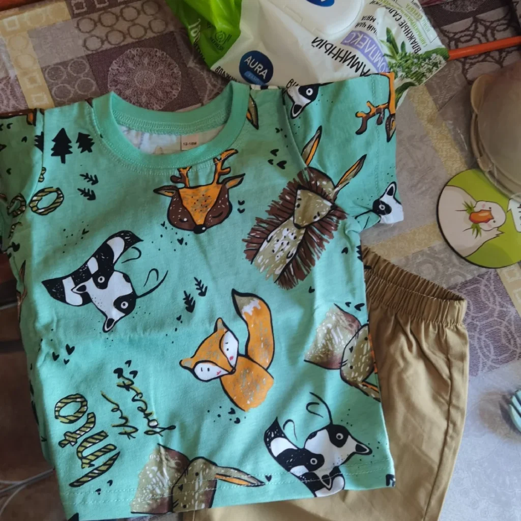 Beautiful suit. Well sewn, the threads do not stick out anywhere. There are no foreign odors. The shorts are thin. Medium-density cotton T-shirt. The drawing is clear and bright. The suit is suitable for summer. I don’t know about the sizes. I bought it as a gift for my child’s first birthday. I hope it fits.