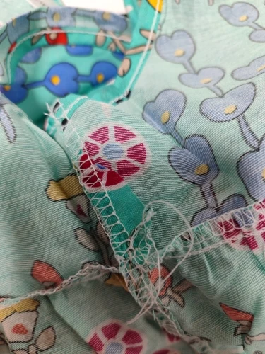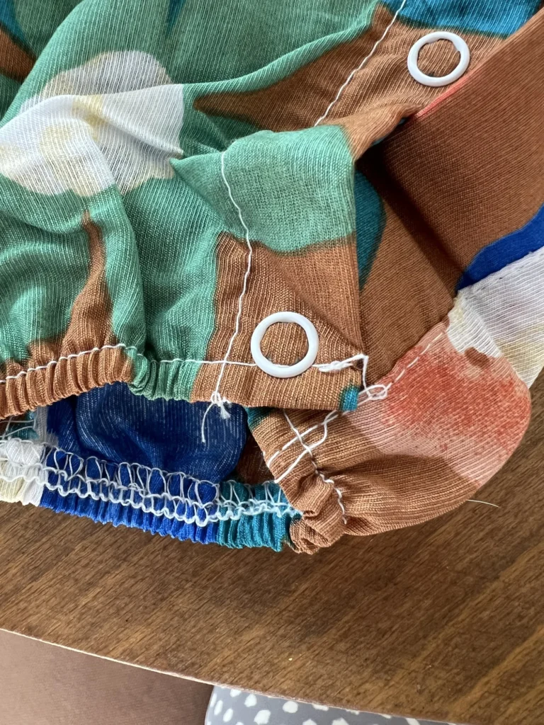 Cute jumpsuit, the white stitching is a bit confusing. I took the size 81 cm to have some room. The threads stick out, but it doesn’t seem critical. I don’t quite believe it’s 100 cotton, it feels like glass fabric, we’ll see after washing.